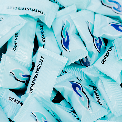 Pose med 100 bolsjer med demenssymbolet på indpakningen, som fx kan bruges til uddeling ved arrangementer og events.