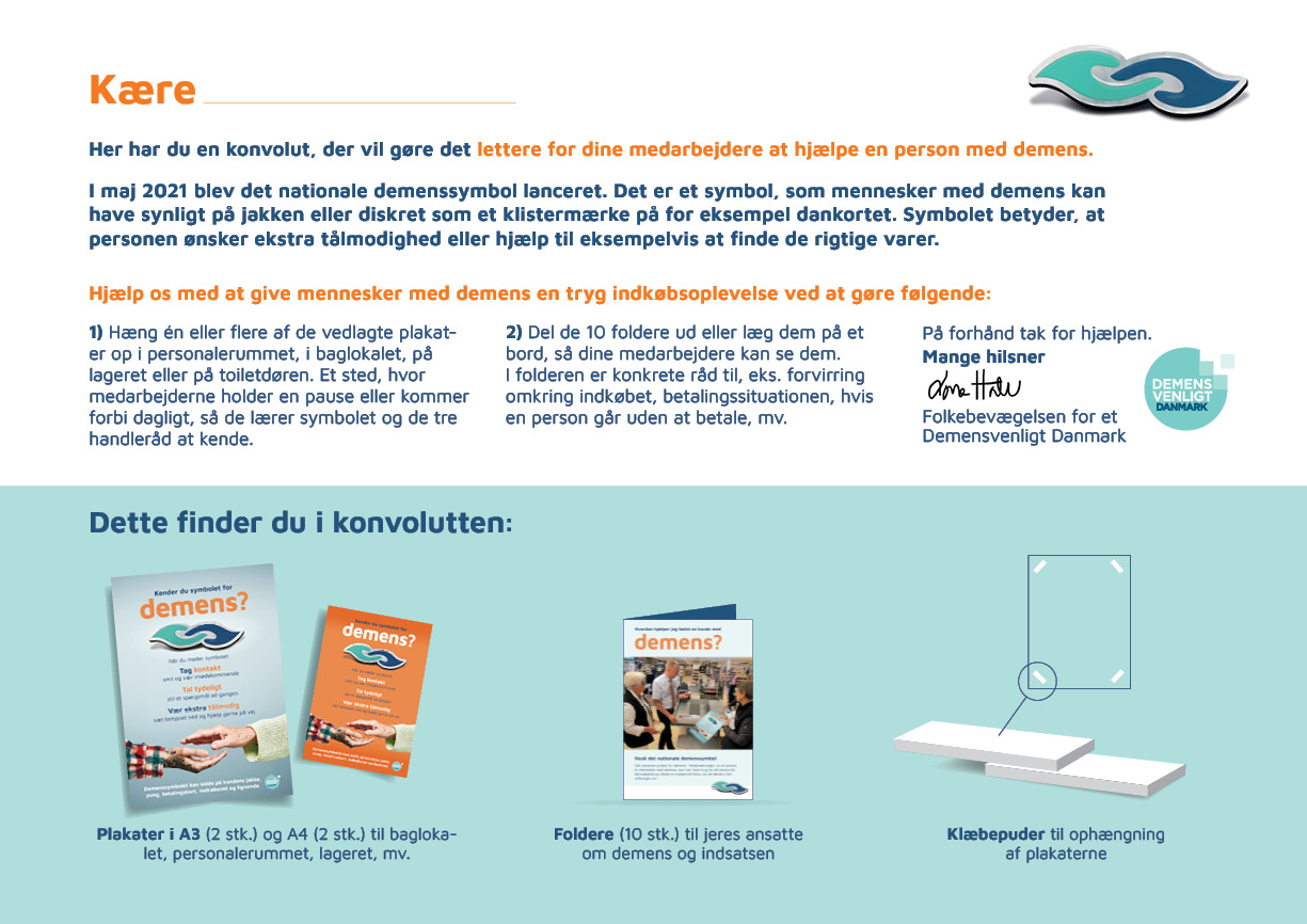 Konvolutten indeholder plakater, foldere og klistermærker. Uddeles til personalegruppen i butikken, så de får kendskab til demenssymbolet og viden om, hvordan de kan hjælpe kunder med demens. I konvolutten er to klistermærker “Her kender vi demenssymbolet”, som kan hænges op i indgangspartiet, kassen eller andre steder i butikken til at signalere overfor dem, der bærer demenssymbolet, at butikken og personalet har kendskab til symbolet.