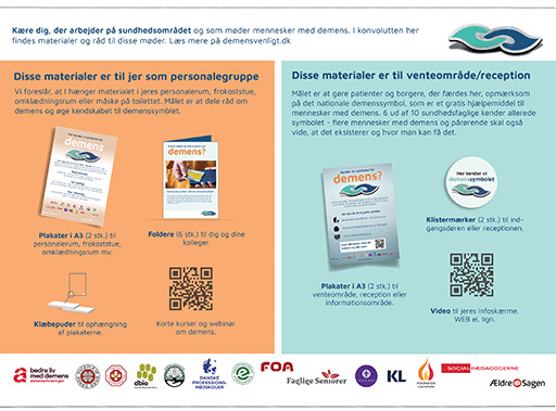 Vi har samlet plakater, foldere, grafik, videoer og andet, der gør det nemt at sætte demens på dagsordenen uanset om du er frivillig, fagpersonale eller en del af en organisation.